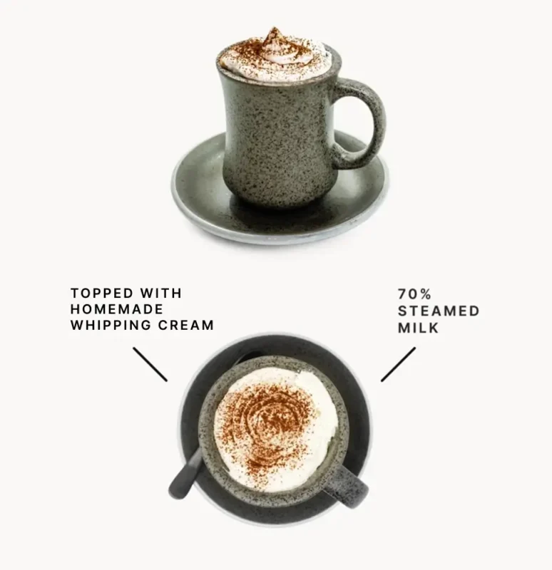 LATTE A milk coffee with a silky and a thin layer of frothed milk on top. 25.00 AED FLAT WHITE A well balanced coffee with a smooth and velvety texture and creamy taste. 25.00 AED HOT SPANISH A sweet and well balanced coffee, smooth and creamy taste 27.00 AED PICCOLO A short version of latte, and has a small amount of microfoam on top 23.00 AED CAPPUCCINO Equal parts espresso, steamed milk, and milk foam, offering a strong coffee flavor with a frothy texture 25.00 AED HOT CHOCOLATE A very smooth and creamy texture of milk and cacao powder and inhance it with the homemade whipping cream on top 25.00 AED MACCHIATO Espresso with a stain or dash of frothed milk 24.00 AED ESPRESSO A concentrated, intence and full bodied coffee, brewed by forcing hot water under pressure through finely ground coffee beans. 21.00 AED Long Black An espresso extracted directly over the hot water. 23.00 AED